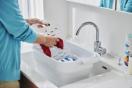 つけ置き洗いに必要なアイテムが揃った、おしゃれなプラスチック製のたらい。