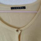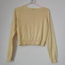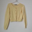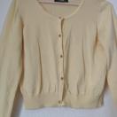 イエローの長袖カーディガン、ボタン付きでリブ編みのデザイン。