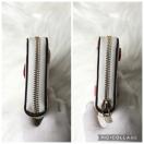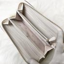 ジップアラウンド式開閉、内側に札入れ、ファスナー式小銭入れ、複数のカードスロット、背面には外ポケットを備えています。