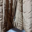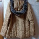 スナップボタンで取り外し可能なフェイクファー付きフードと縦ラインのキルティングデザインが特徴の中綿入りジャケット。