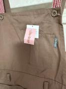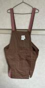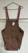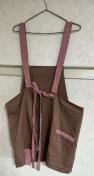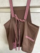 ブラウンのエプロン、チェック柄ストラップ付き、前面にポケットあり。