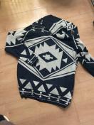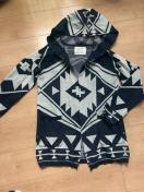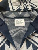ジオメトリックパターンのフード付きカーディガン、ネイビーとグレーの配色でスタイリッシュ。