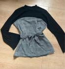 チェック柄と無地のデザインが特徴のウエストリボン付き長袖トップス。
