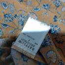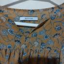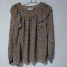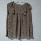 からし色にのブルーの花柄でフリル付きの長袖ブラウス。