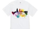 鮮やかな水彩アートと都市のシルエットが融合したデザインTシャツ。