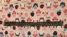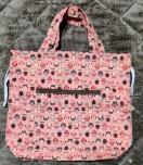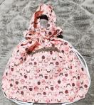 薄ピンク色の生地に沢山の可愛いフクロウ柄に外ポケットを付けた巾着バックです。