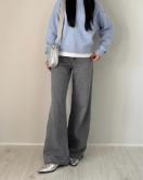 ミドルウエストでヒップはよりフィットし、ひざ下からフレアになるワイドシルエットで脚が長く見える。ワイドな裾との対比ですっきりとしたウエストまわりを演出。