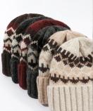北欧風のフェアアイル柄が印象的な折り返しデザインのニット帽です
