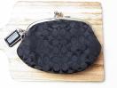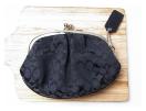 こちらは、シックなブラックカラーのシグネチャー柄が特徴的ながま口コインケースです。開口部が大きく開く口金タイプのため中身が見やすく、小銭がたっぷり収納できます。ジャガード生地の立体感と、縁取りやチャームに施されたレザーと金具が上品なアクセントとなっています。