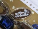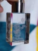 ミッキーマウスがクリスタルガラスの中で、クリスマスプレゼントを後ろ手(右手)に持って左手を上に上げているボーズをしています。