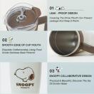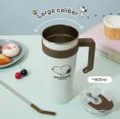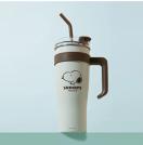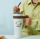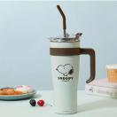 SNOOPYデザインのストロー付きタンブラー、持ち運びに便利なハンドル付き。