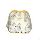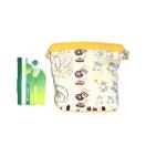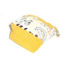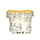 ・底マチ幅を広くとってるので紐を締めるとまるっこくなってかわいいです。底マチと紐通し部分は黄色ドット柄をあわせました。