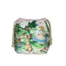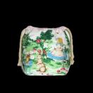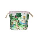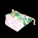 ・底マチ幅を広くとってるので紐を締めるとまるっこくなってかわいいです。底マチと紐通し部分はピンクダマスク柄をあわせました。