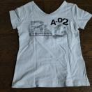 テキストプリントが特徴的なホワイトのVネックTシャツ。