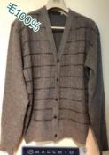 特価美品MACCHIO日本製チェック柄V衿前開きニットカーディガングレー系長袖毛100%アウターセーター大活躍通勤フォーマル