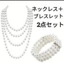 ロングパールネックレスと3連ブレスレットのセットです。ネックレスは金具なし1重ロングタイプなので重ねて2重や3重にもできます。ブレスレットは付け外ししやすいゴムタイプです。