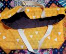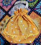黄色の生地に白色の三角柄と薄々黄色三角柄のマチ付き巾着バックです。