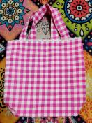 白色とピンク系のこうし柄の小さめバックに白色のレースを付けた可愛いマチ付きバックです。