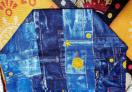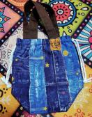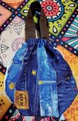 紺色のジーィンズ柄(ポケット、小さな星柄等)のマチ付き巾着バックです。