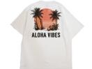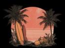 デザインの主役は、ビーチの象徴であるヤシの方サーフボード。どこか懐かしいヴィンテージポスターのような風合いで、こなれた大人カジュアルを演出します。