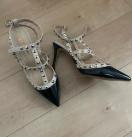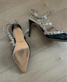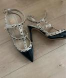 スタッズ付きのストラップハイヒール、黒と白のコンビネーションで洗練されたデザイン。