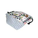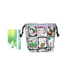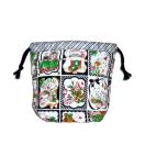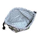 ・底マチ幅を広くとってるので紐を締めるとまるっこくなってかわいいです。底マチと紐通し部分は銀ラメストライプ生地をあわせました。