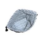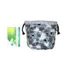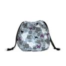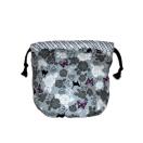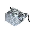 ・底マチ幅を広くとってるので紐を締めるとまるっこくなってかわいいです。底マチと紐通し部分は銀ラメストライプ生地をあわせました。