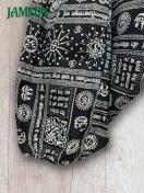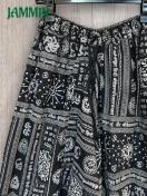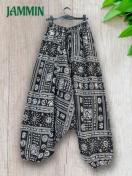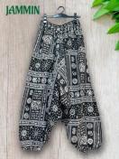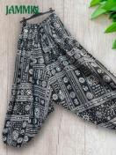 黒色ベースのアジアン柄(オーム、ブッダアイ、ヒンディ語、卍など)サルエルパンツです。