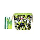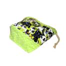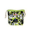 ・底マチ幅を広くとってるので紐を締めるとまるっこくなってかわいいです。底マチと紐通し部分は黄緑ドット地をあわせました。
