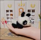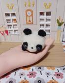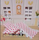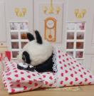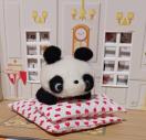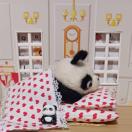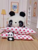 羊毛フェルト製の可愛いパンダのぬいぐるみとハート模様の布団セット。