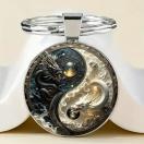 陰陽ドラゴンキーホルダー - エレガントな合金製ラウンドペンダント、黒と白の龍デザイン、バッグやリュックに最適、ユニークなギフト、スタイリッシュアクセサリー | メタリック仕上げ、合金構造、ドラゴンデコレーション、ハロウィーン・クリスマス用、ホリデーギフト、象徴的なジュエリー、高品質チャーム、耐久性抜群、ファンタジーファン向け、おしゃれなキーリング