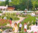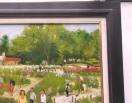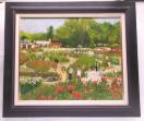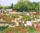 久宝寺緑地公園の中にある芍薬園を俯瞰した作品である。金剛生駒山系のふもと河内野の一角にあるこの公園は大阪市、東大阪市、八尾市にまたがり、服部、大泉、鶴見と共に大阪府の四大緑地公園の一つ、甲子園球場の10倍の広さがある。公園の樹林に囲われた芍薬園は5月上−中旬が見頃。樹間を渡る初夏の薫風。多彩に咲き乱れる芍薬。散策する人々の点景。季節の風物詩を表現主義的に、明快な筆致で描きました。(金山ヒロシ)