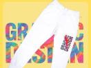 カラフルなグラフィックロゴが目を引くホワイトパンツ。