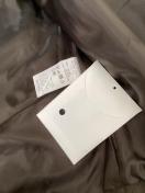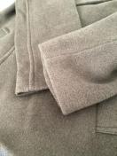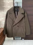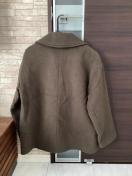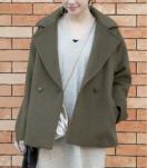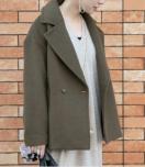 大きめの衿のW前仕様に腰付近にダーツをとったコクーンシルエット、ドロップショルダーの肩周りがゆったりしたデザインが女性らしい1枚です。