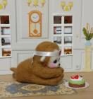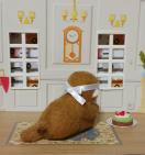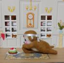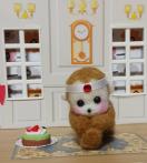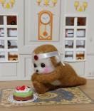 羊毛フェルト製のさるちゃんがケーキの前でストレツチする可愛いデザイン。