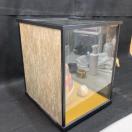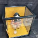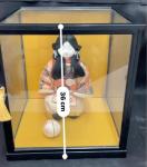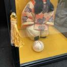 ガラスケースに入った美しい木目込人形、蹴ってているポーズで、布製のボール付き。