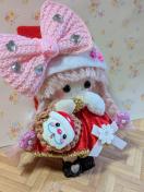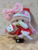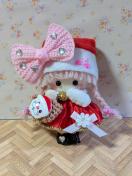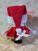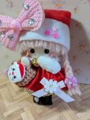 サンタ服を着て帽子に大きいピンクリボンをつけた女の子ドールです。