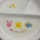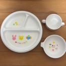 男女兼用でお使い頂けます。スープの器の絵が少しはげていますので写真を参照して下さい。大きなお皿は後ろに吸盤があり滑り止めが付いています。