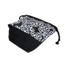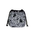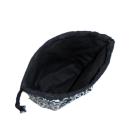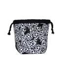 ・底マチ幅を広くとってるので紐を締めるとまるっこくなってかわいいです。底マチと紐通し部分と裏地は黒無地をあわせました。