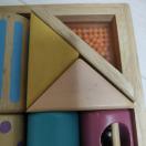 多様な形状と色の木製知育玩具、積み木と音の要素を含む。