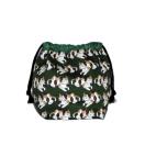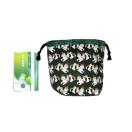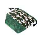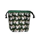 ・底マチ幅を広くとってるので紐を締めるとまるっこくなってかわいいです。底マチと紐通し、裏地部分は緑色柄をあわせました。