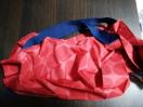 赤いドット柄のエコバッグ、ネイビーのストラップ付き