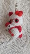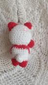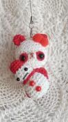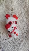 レース糸で編んだ雪だるま抱えたカラフルぱんだです。
