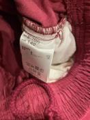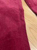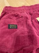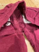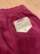 柔らかいコーデュロイ素材のバーガンディ色の長ズボン、ウエストはゴム入りで調整可能。