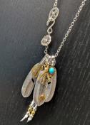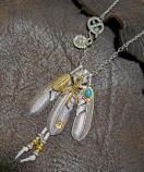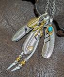 本格的なインディアンジュエリーとして中央のフェザーをメディスンホイール組みした上でフェザー3枚重ね致しました。フェザーをチェーンに並べただけの物と異なり、絶妙の重ね具合の仕上がりになります♪