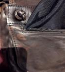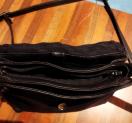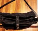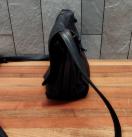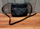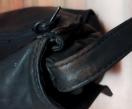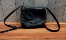 調整可能なショルダーストラップとフラップ付きのやわらかい黒レザーショルダーバッグ。