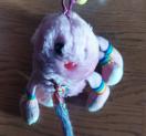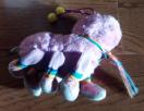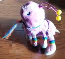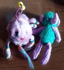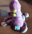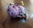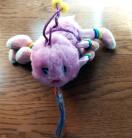 カラフルなストライプの足を持つピンクのむかで型?ぬいぐるみ。
