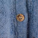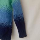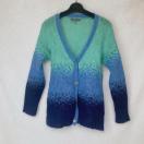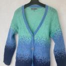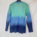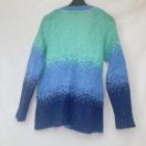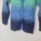 青から緑への美しいグラデーションが特徴のニットカーディガン、Vネックデザインでボタン付き。