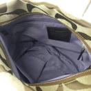 ベージュとブラウンのロゴパターンが特徴のショルダーバッグ。