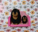 羊毛フェルト製のダックスフント親子のぬいぐるみセット、ソファ付きで可愛らしいデザイン。